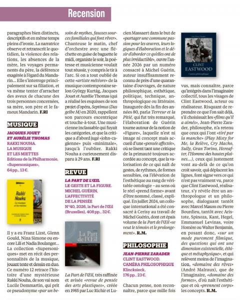 n° 40 (2026), "Le Geste et la Figure. Michel Guérin, l'affectivité de la pensée" a été recensé par Robert Maggiori dans le journal Libération du samedi 31 janvier 2026.