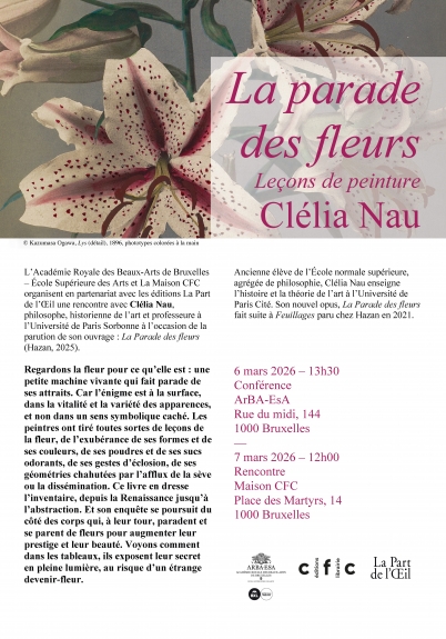 L’Académie Royale des Beaux-Arts de Bruxelles – École Supérieure des Arts et La Maison CFC organisent en partenariat avec les éditions La Part de l’œil une rencontre avec Clélia Nau, philosophe, historienne de l’art et professeure à l’Université de Paris Sorbonne à l’occasion de la parution de son ouvrage : La Parade des fleurs (Hazan, 2025).